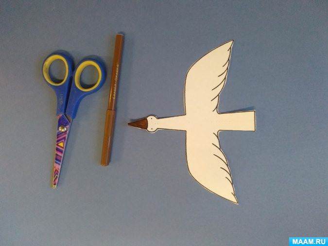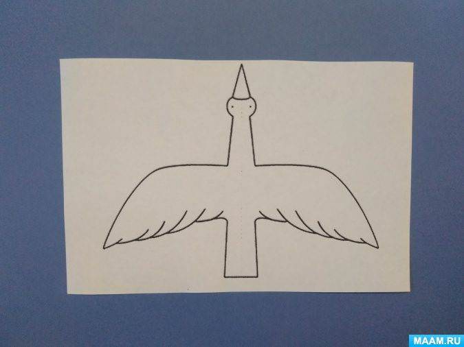 Здесь у нас журавлик, сделайте его из бумаги любимого цвета, а раскрасить птицу можно мелками, маркерами.